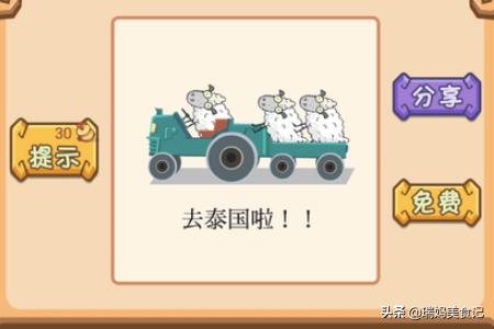 第27关,三只绵羊,开车去泰国旅游,显然是 三阳开泰。这里利用的是谐音。