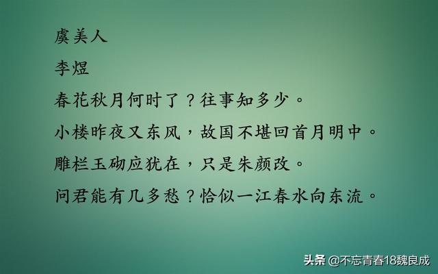 春花秋月何时了,往事知多少?小楼昨夜又东风,故国不堪回首月明中。